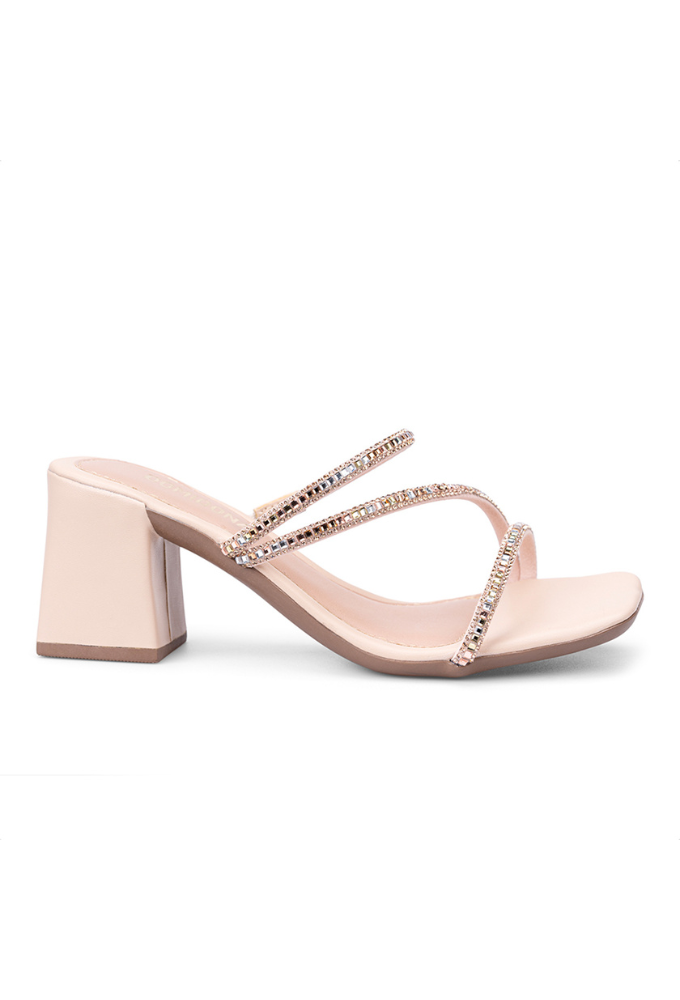 Especial DomidonaSandália Nude Salto Grosso Tiras Triplas De Strass