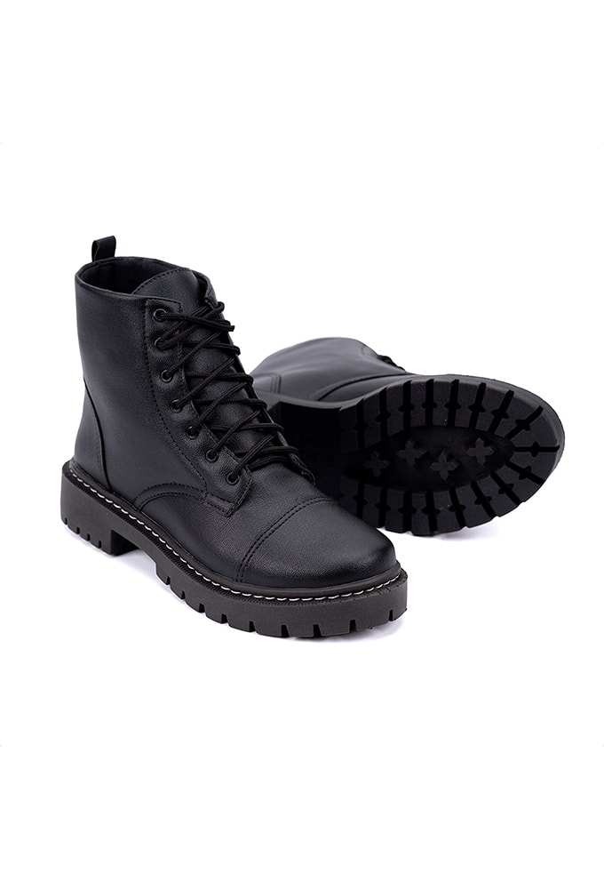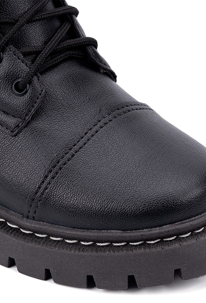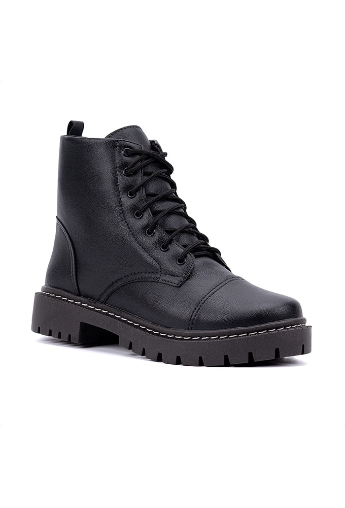 A bota coturno feminina é de cor única desde a sola até seu cabedal, com uma característica marcante que é a costura branca na sola que percorre toda lateral do sapato. Um modelo de coturno casual com pegada urbana, você vai poder montar looks monocromáticos com ele. Os detalhes em costuras são encantadores.