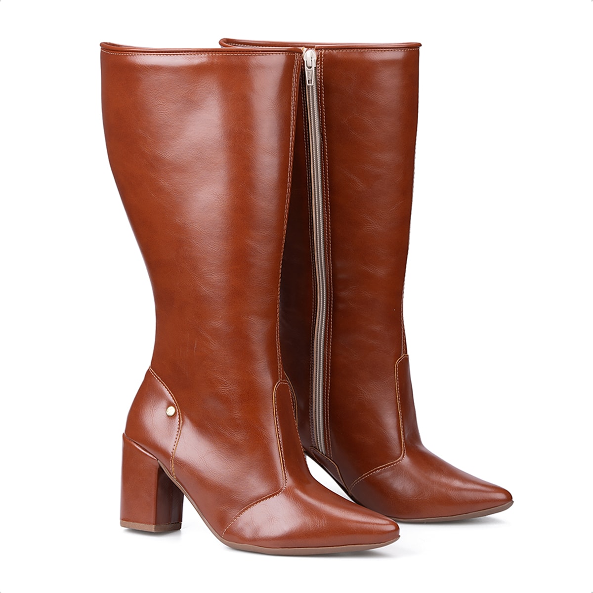 Bota Social Feminina Caramelo Cano Alto Bico Fino Salto Alto Bloco