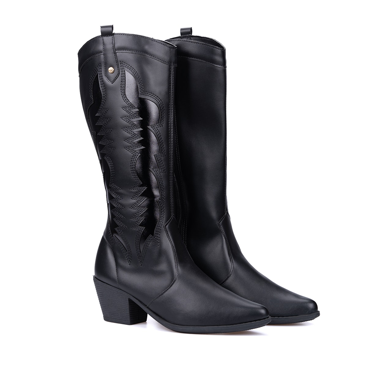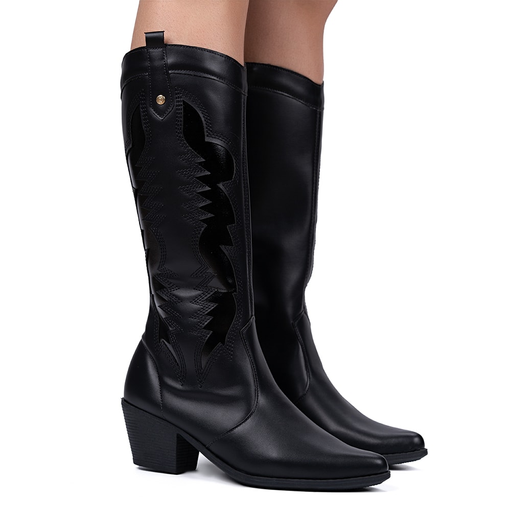 Bota Texana Feminina Western Preta Cano Longo Metalizado Bico Fino