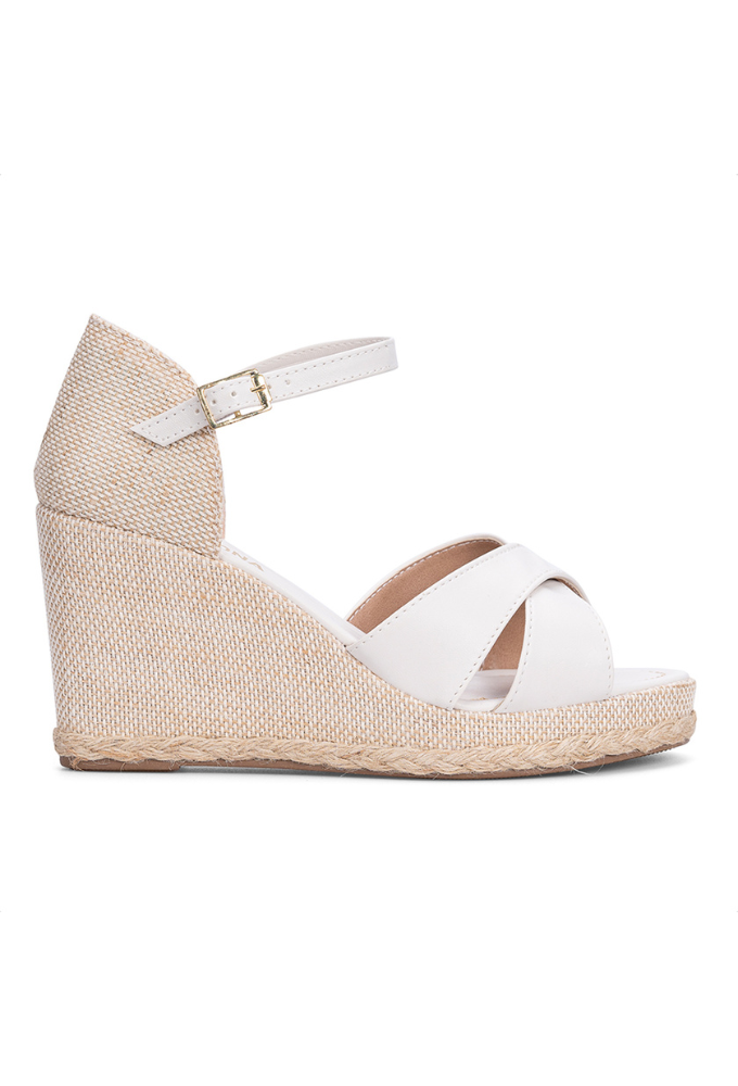 Sandália Anabela Off White Tiras Cruzadas Traseira Fechada