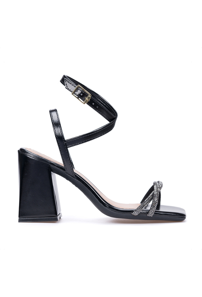 Especial DomidonaSandália De Amarração Preta Salto Bloco Tiras De Strass
