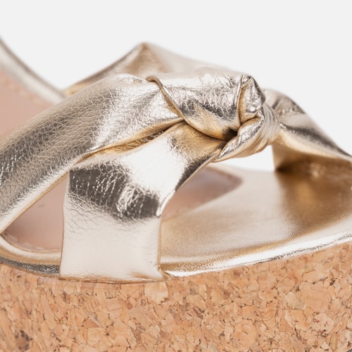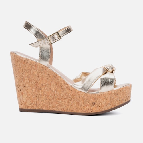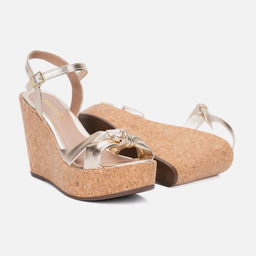 Sandália Feminina Anabela Dourada Plataforma Tira Em Laço