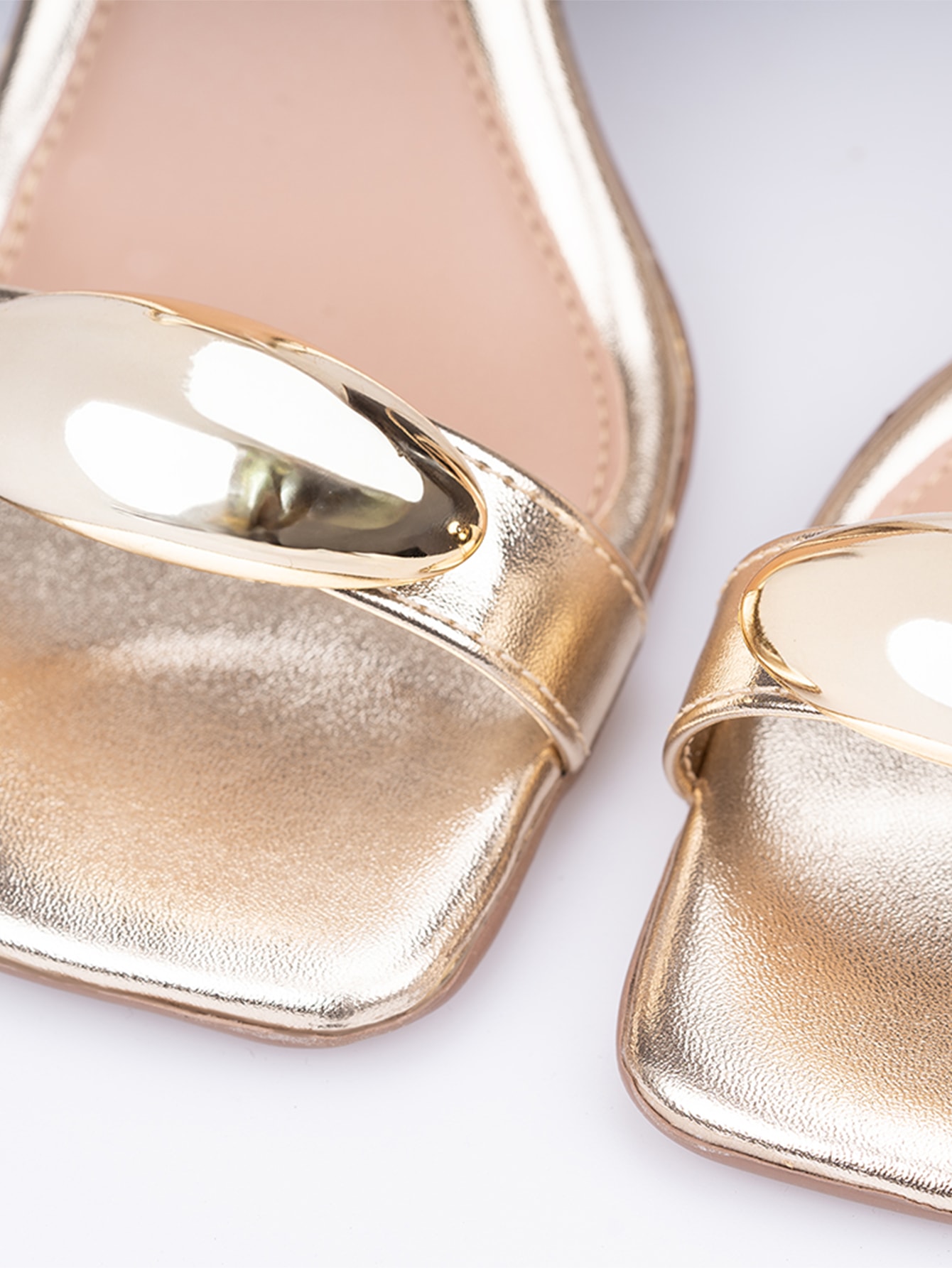 Com um design minimalista e sofisticado, a sandália lesma de salto da Domidona se destaca pelo ABS dourado em sua tira frontal, trazendo um toque de modernidade e elegância. Sua tira no tornozelo, com fechamento ajustável, proporciona segurança e conforto em cada passo.