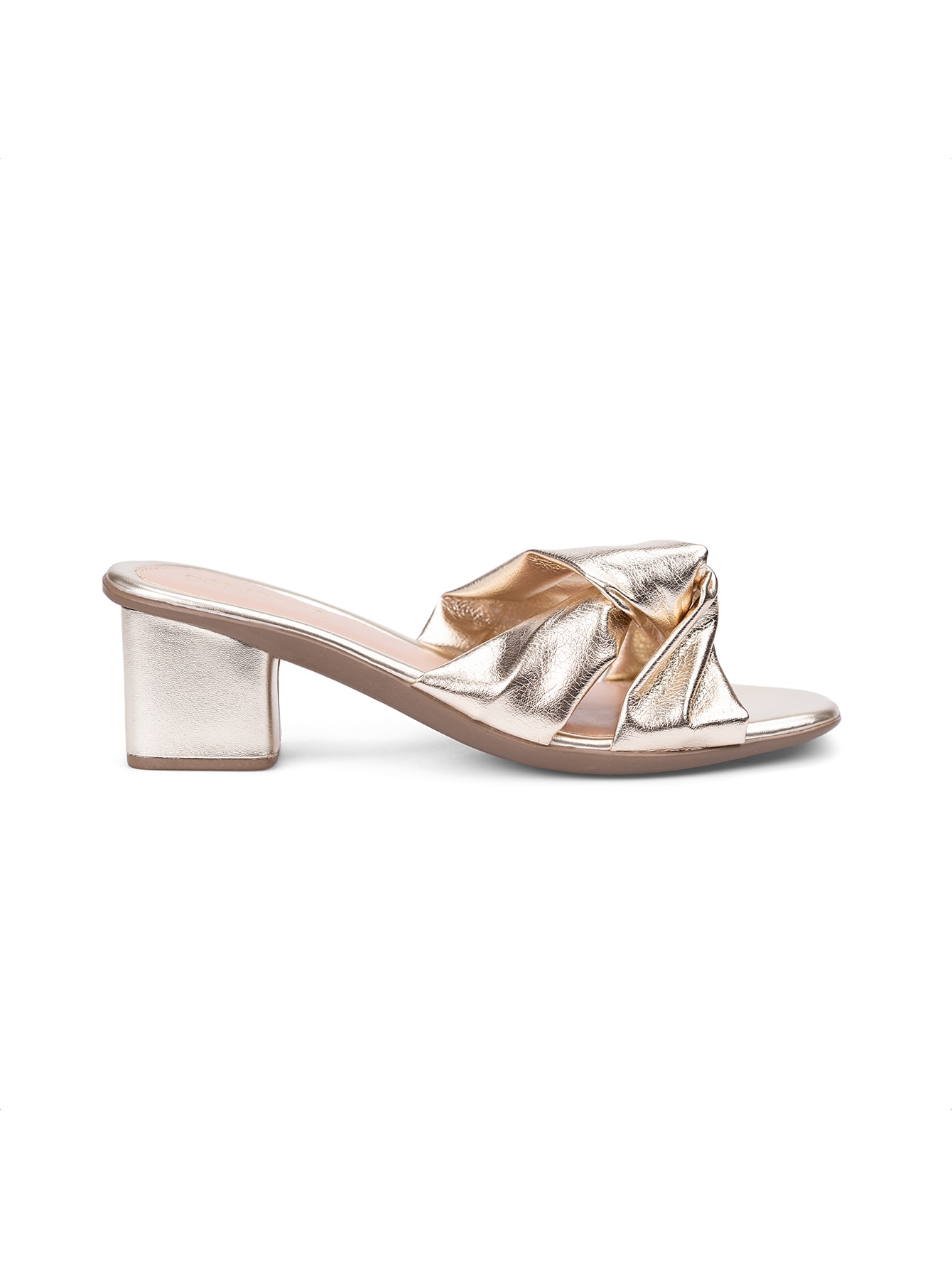 Sandália Feminina Laço Bico Quadrado Salto Médio Bloco Dourada