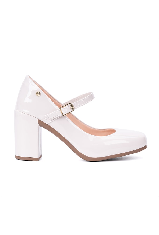 Sandália Feminina Mary Jane Salto Bloco Grosso Bico Quadrado Off White Verniz