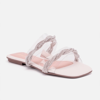 Especial DomidonaSandália Feminina Rasteirinha Amarração Tiras De Strass Off White