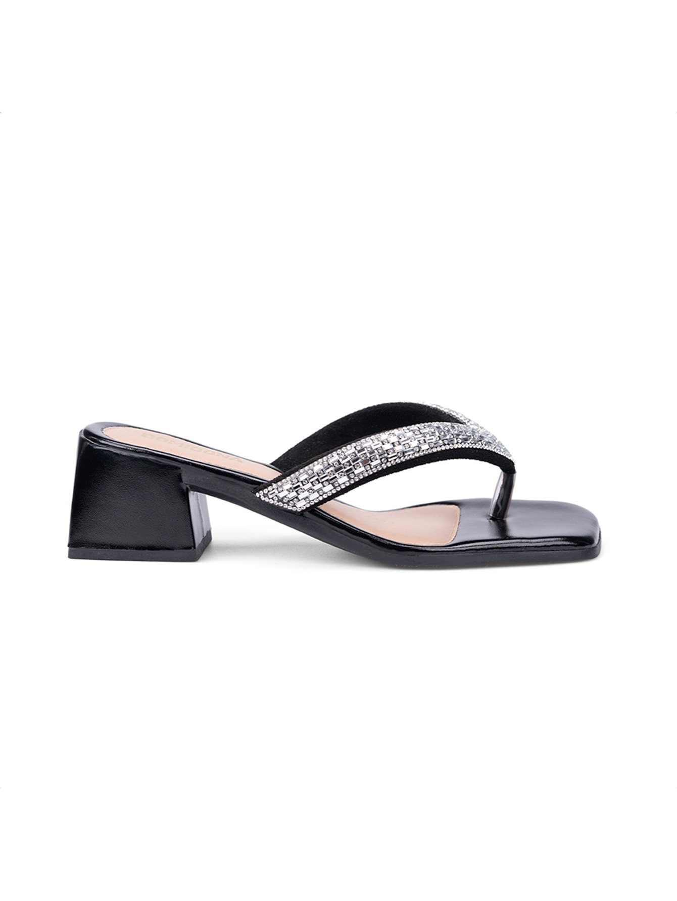 Sandália Feminina Tamanco Salto Bloco E Tira De Strass Preta