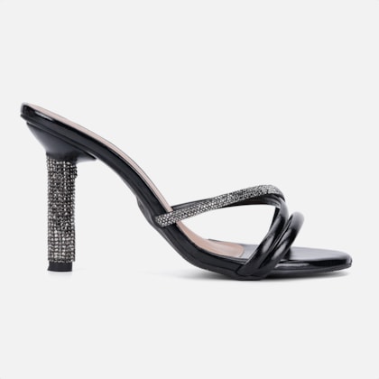 Sandália Preta Salto Grosso Tiras Triplas De Strass