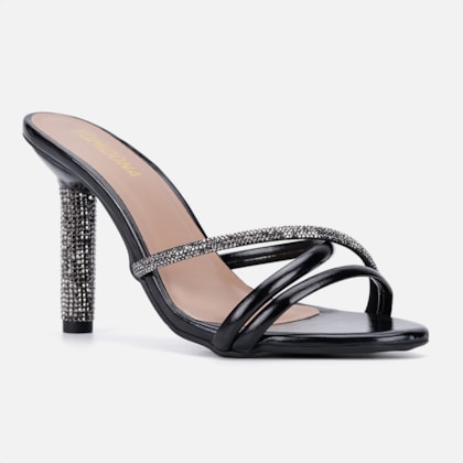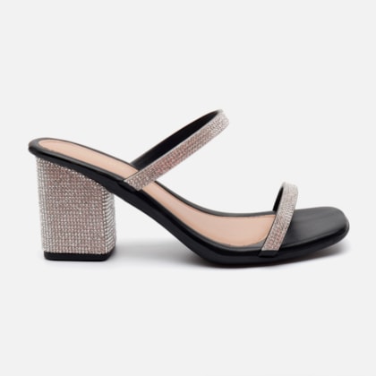 Especial DomidonaSandália Preta Salto Grosso Tiras Triplas De Strass