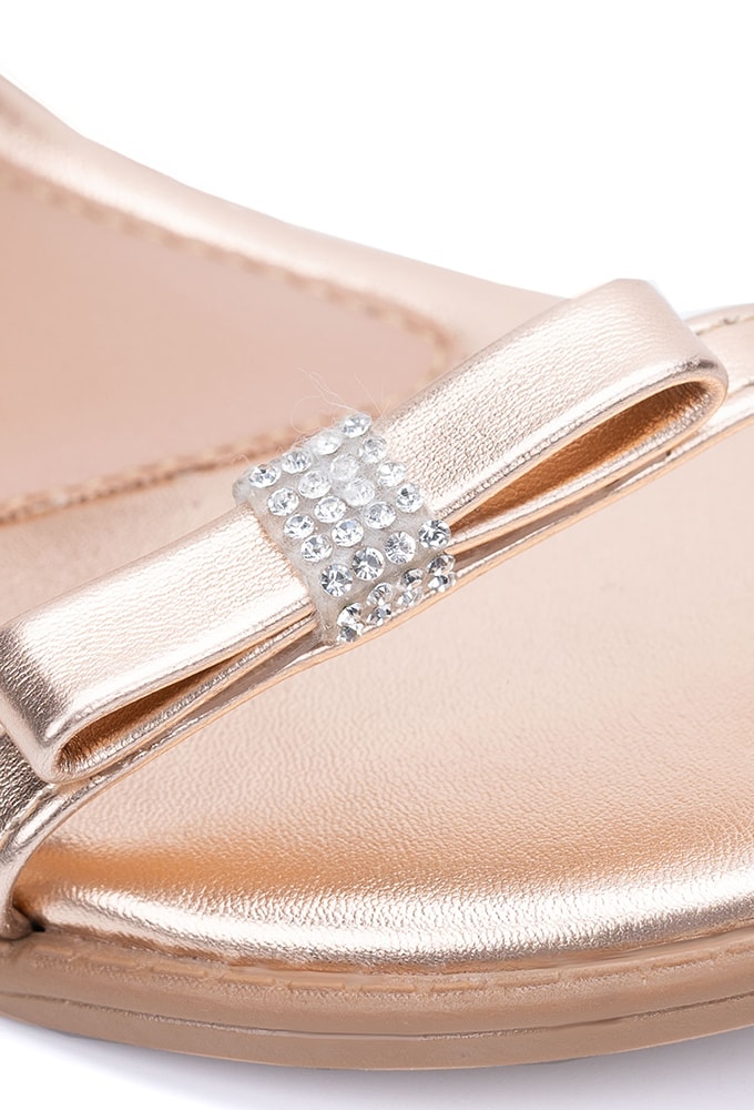 Com tiras delicadas e um laço frontal adornado com strass, essa sandália possui um acabamento brilhante e elegante. O fechamento com fivela ajustável oferece um ajuste seguro e confortável, permitindo que as meninas se movam com liberdade durante brincadeiras, danças e aventuras, garantindo praticidade e estilo o tempo todo.
