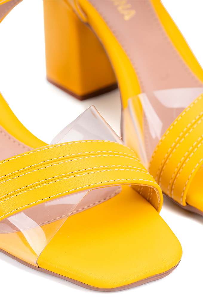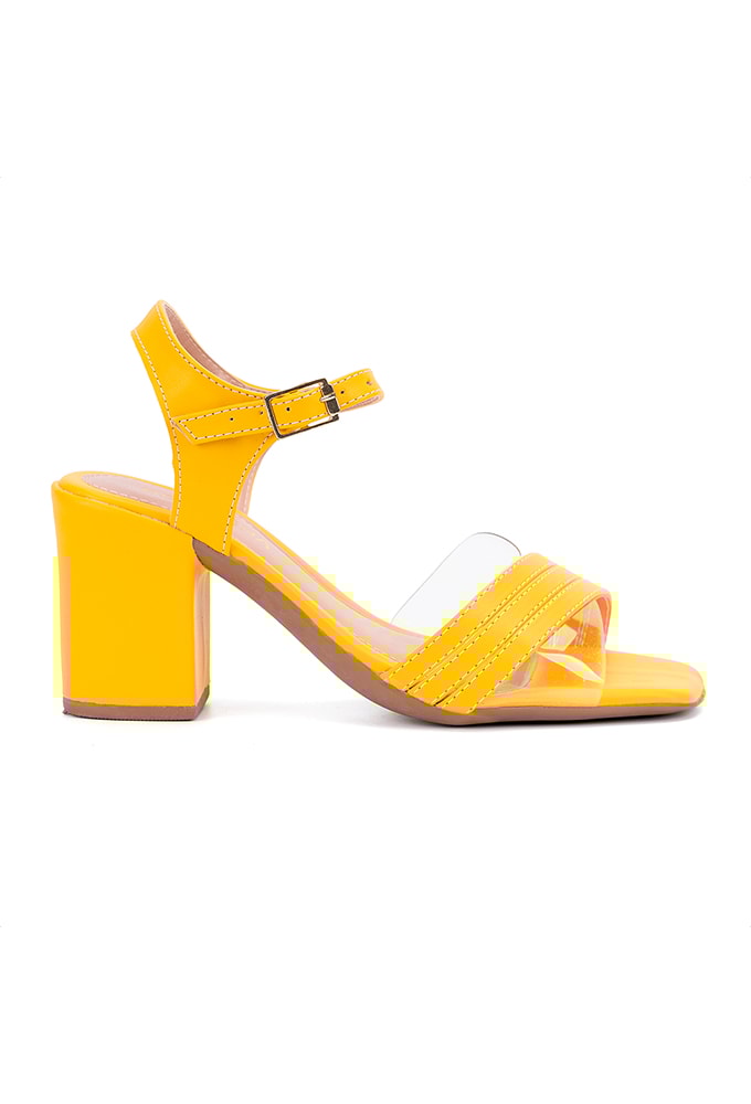 Sandália Salto Bloco Tiras Cruzadas Transparente Vinil Bico Quadrado Amarelo