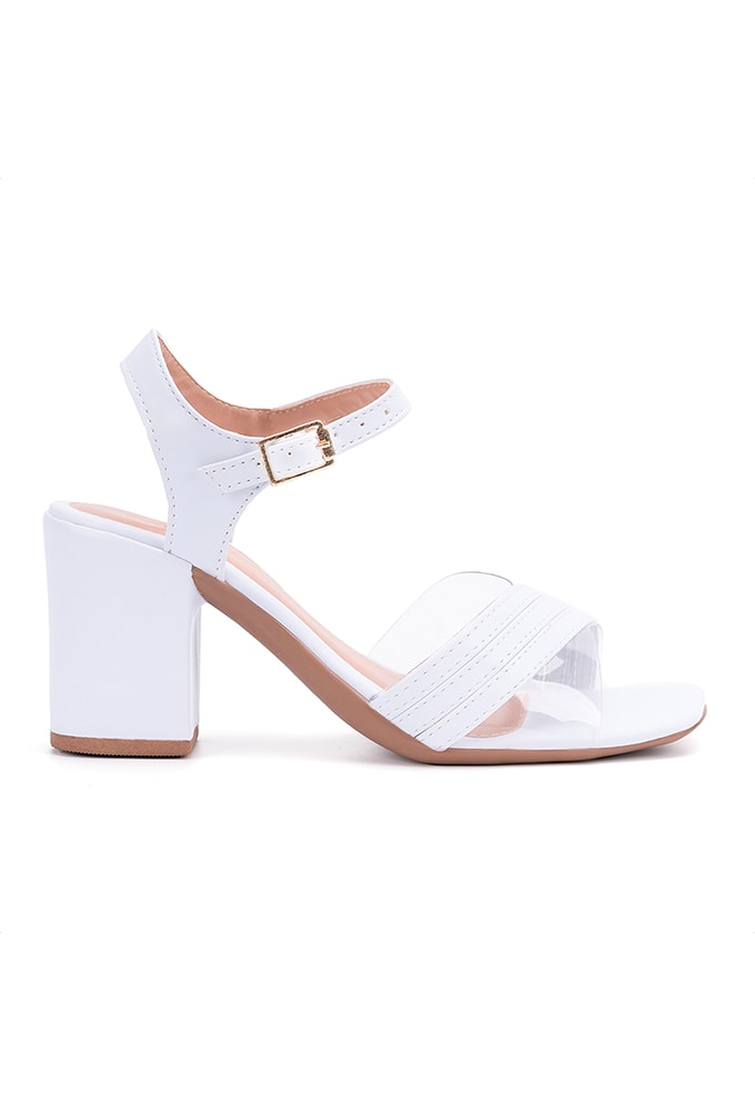 Especial DomidonaSandália Salto Bloco Tiras Cruzadas Transparente Vinil Bico Quadrado Branco