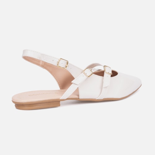 Sapatilha Feminina Slingback Bico Fino Verniz Tiras E Fivela Off White