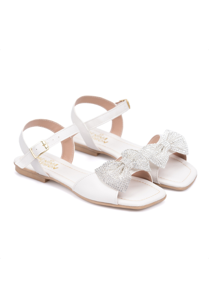 Rasteira Infantil Off White Bico Quadrado Laço De Strass