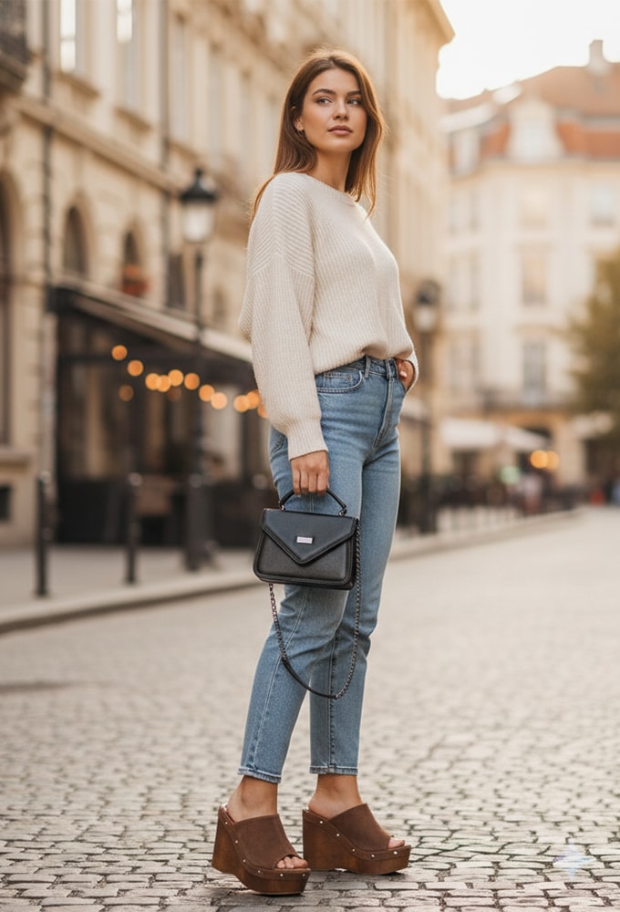 - Com jeans flare: Reviva o espírito dos anos 70 com uma produção despojada e estilosa. A sandália alonga a silhueta e o look se torna uma ode ao movimento retrô.