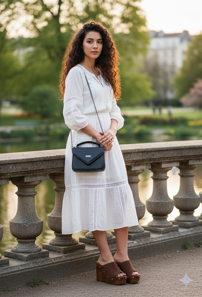 - Com vestidos fluidos: Crie um visual romântico e leve, ideal para um almoço de domingo ou um passeio no parque.