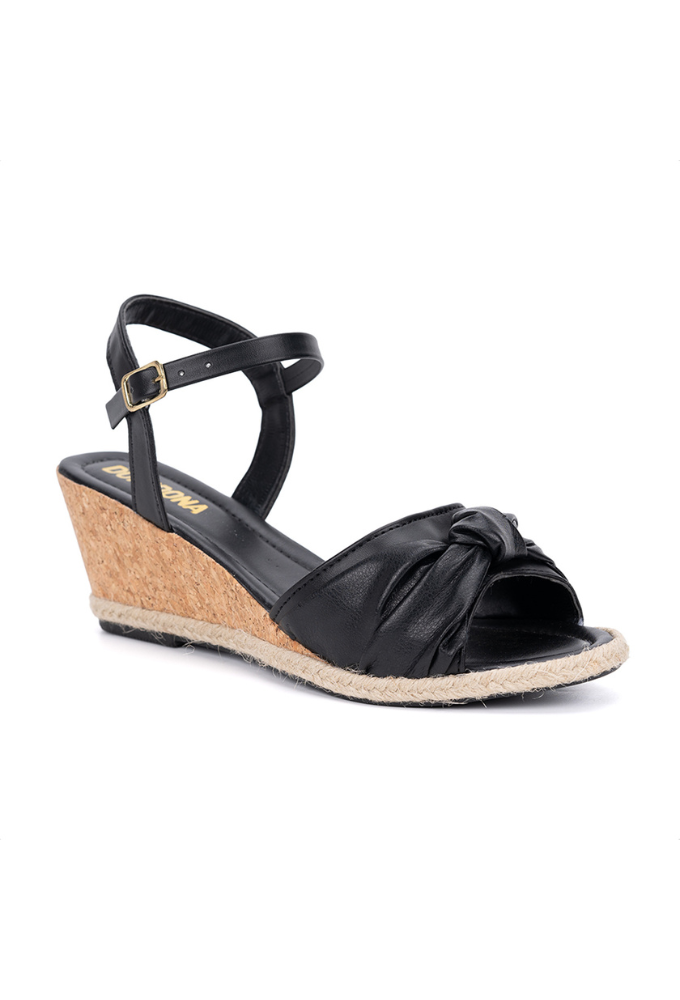 Sandália Feminina Preta Estilo Anabela Tira De Laço