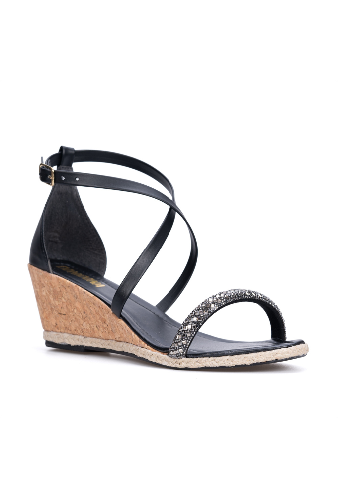 Sandália Feminina Preta Salto Anabela Tira De Strass
