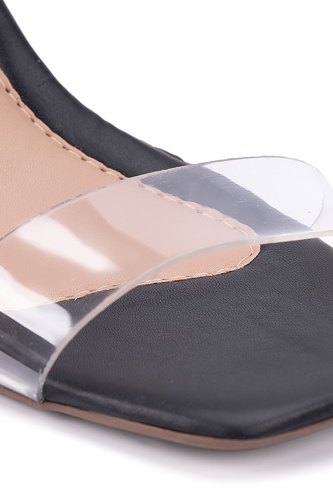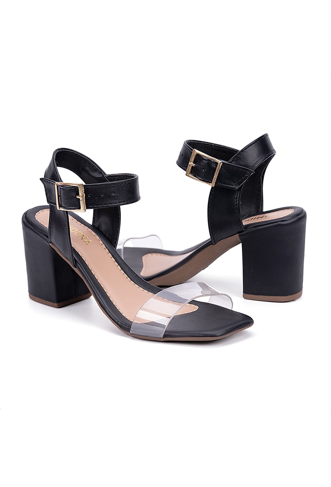 Especial DomidonaSandália Feminina Salto Bloco Bico Quadrado Transparente Preto