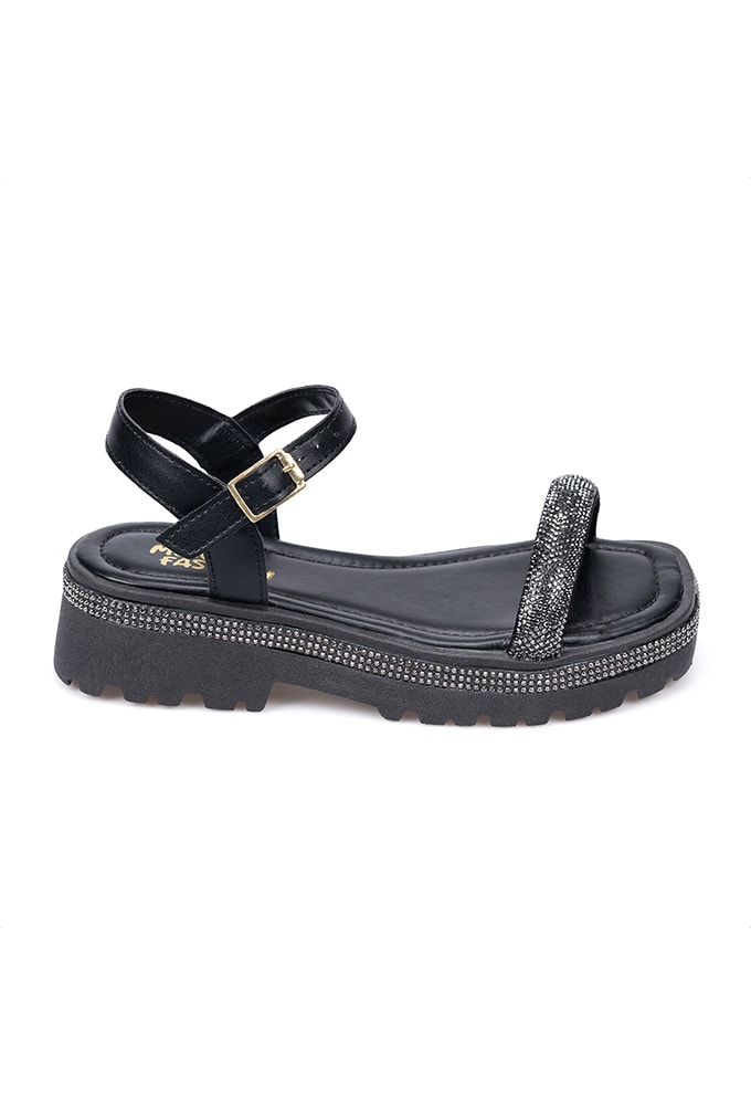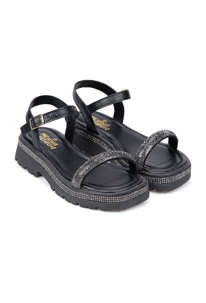 Sandália Infantil Preta Salto Tratorado Tira De Strass