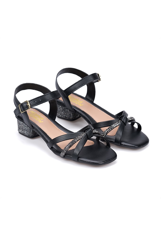 Sandália Infantil Preto Salto Bloco De Strass Tira Laço