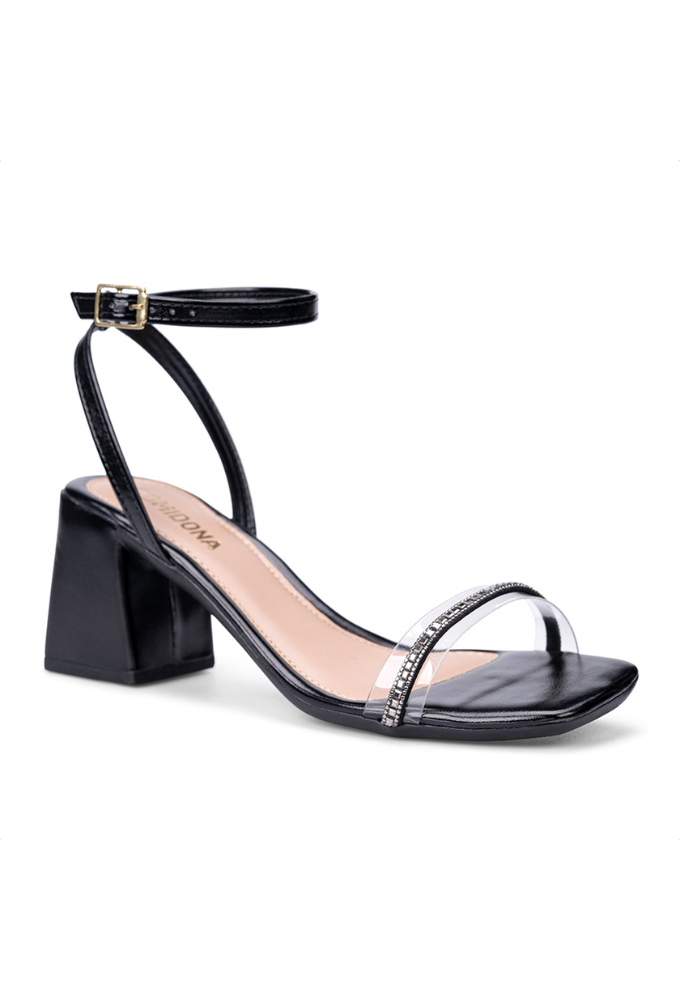 Sandália Preta Tira Transparente De Strass Salto Bloco